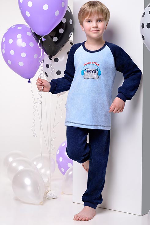 Chlapecké teplé froté pyžamo má přední díl zdobený výšivkou, tmavě modré raglánové rukávy i kalhoty jsou zakončeny nápletem.