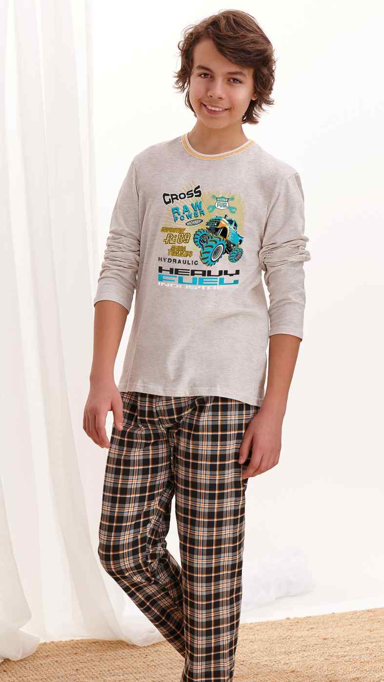Chlapecké pyžamo má rovné kostkované kalhoty a jednobarevný horní díl s potiskem.