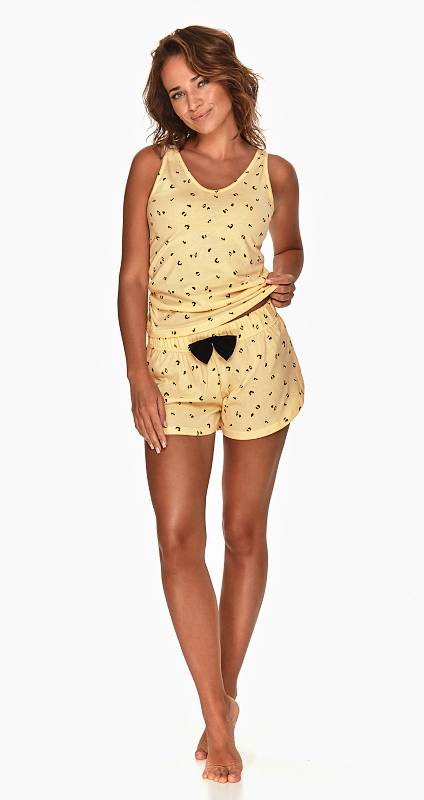 Dámské letní pyžamo má tílko bez rukávů, krátké kalhoty jsou nabrané do široké gumy, ozdobené mašličkou v pase a mají tvarovaný boční okraj.