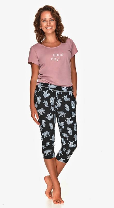 Dámské pyžamo má jednobarevné triko s tiskem a potištěné úzké 3/4 kalhoty. V pase široká guma.