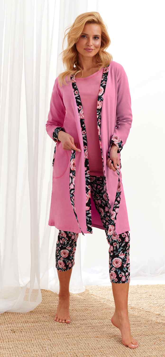 Dámský zavazovací župan je ozdobený potištěným lemováním a vázačkou, má dvě boční kapsy. Materiál: 90% bavlna, 5% polyester, 5% elastan