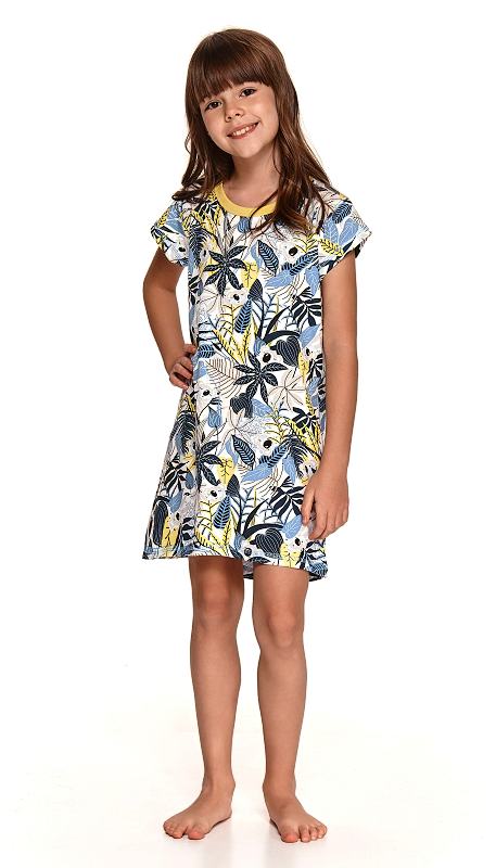 Dětská noční košilka z potištěného materiálu má krátký rukáv a barevné lemování kolem výstřihu.