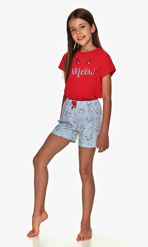 Dětské pyžamo má tričko s krátkým rukávem ozdobené potiskem, potištěné šortky mají v pase širokou gumu a mašličku.