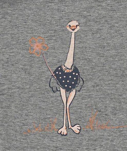 Dívčí noční košile z příjemného materiálu je ozdobená tiskem pštrosa na předním dílu a jemným tiskem na rukávech. U krku oranžové lemování, rovné dlouhé rukávy, spodní díl ukončen rozparky na bocích.