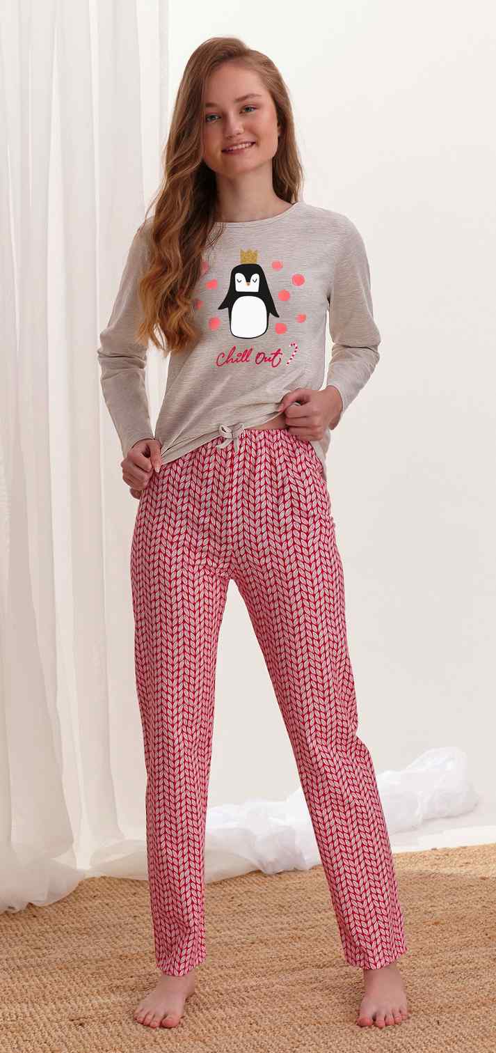 Dívčí pyžamo s dlouhým rukávem má kalhoty z potištěného materiálu, mašličku v pase a rovné nohavice. Jednobarevné triko zdobí tisk se zimním motivem.