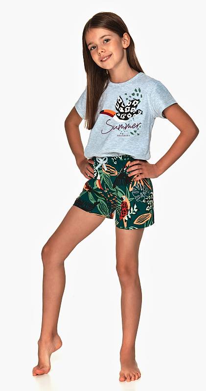 Dívčí pyžamo má tričko s krátkým rukávem ozdobené potiskem, potištěné šortky mají v pase širokou gumu a mašličku.