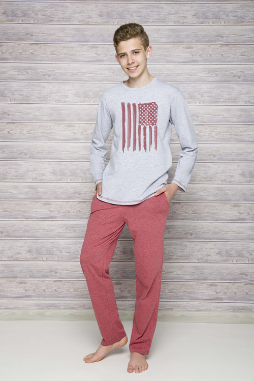 Chlapecké pyžamo má jednobarevné kalhoty s kapsami, rovné nohavice. Horní díl pyžama v šedém melíru má rovné rukávy a přední díl je ozdobený tiskem.