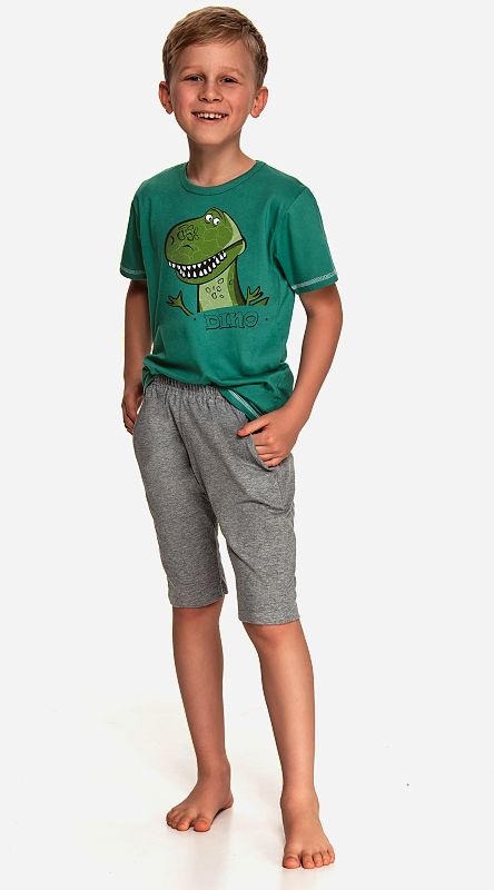 Dětské pyžamo má triko zdobené obrázkem dinosaura a kontrastním štepováním. Kalhoty jsou v délce ke kolenům, mají dvě kapsy a v pase šerší gumu.