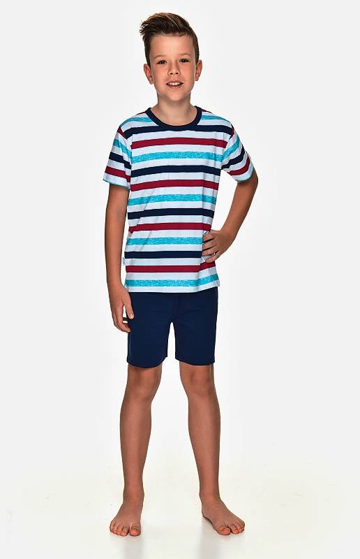 Chlapecké pyžamo s krátkým rukávem má potištěné tričko s lemem u krku. Jednobarevné šortky mají v pase širší všitou gumu.