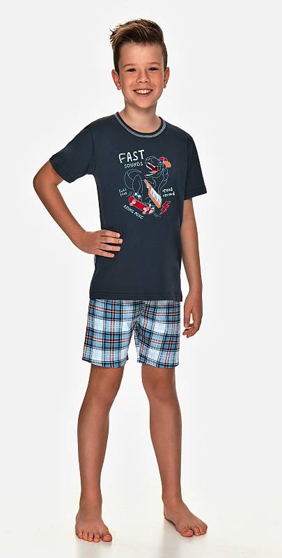 Chlapecké pyžamo s krátkým rukávem má jednobarevné tričko s potiskem, lemování u krku. Kostkované šortky mají širší všitou gumu.