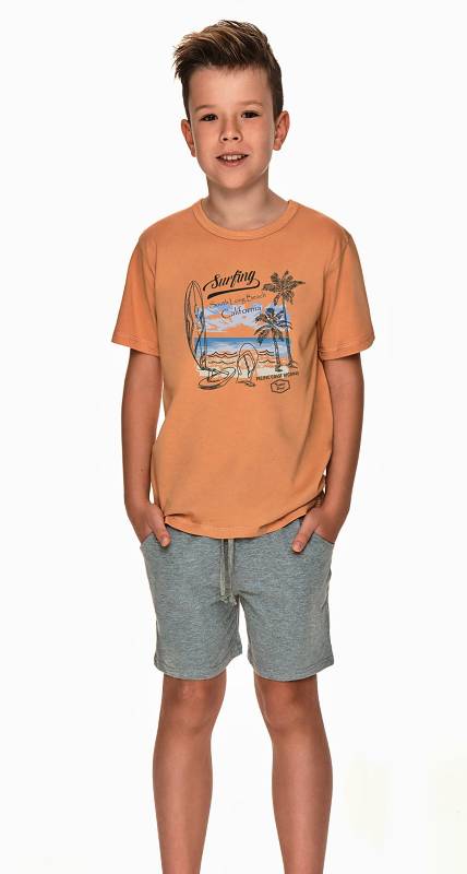 Dětské pyžamo s krátkým rukávem má jednobarevné tričko s potiskem, u krku lem. Šortky mají dvě kapsy, všitou gumu v pase a vázačku.