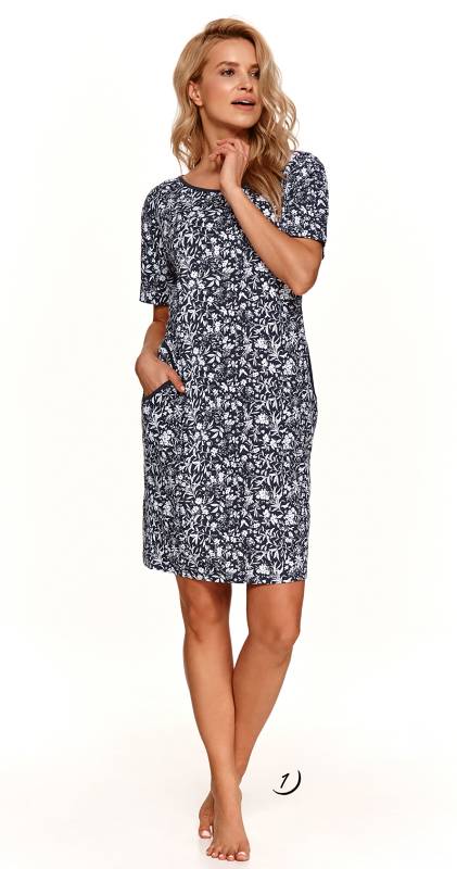 Dámská noční košile je vyrobena z kvalitní potištěné bavlny. Má krátké rukávy, 2 boční kapsy a jednobarevné lemování kolem výstřihu.