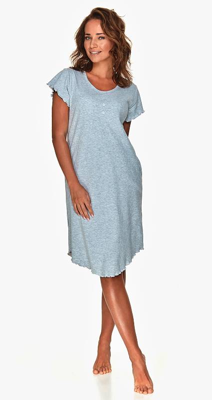 Dámská noční košile z jednobarevného žebrovaného úpletu ozdobená třemi knoflíčky. Boční kapsy, tvarovaný spodní okraj.