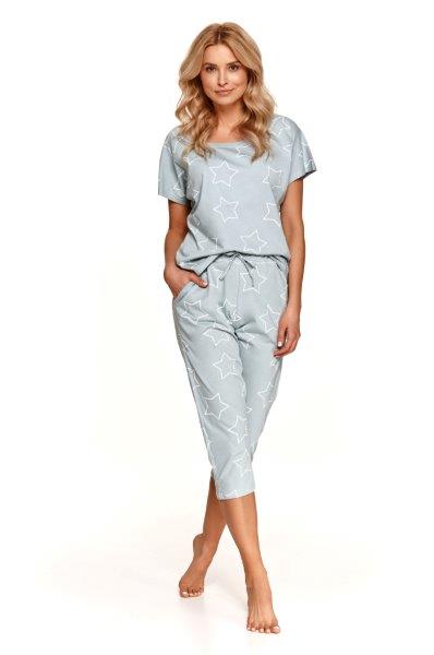Dámské pyžamo s krátkým rukávem má 3/4 rovné kalhoty s kapsami a vázačkou v pase.