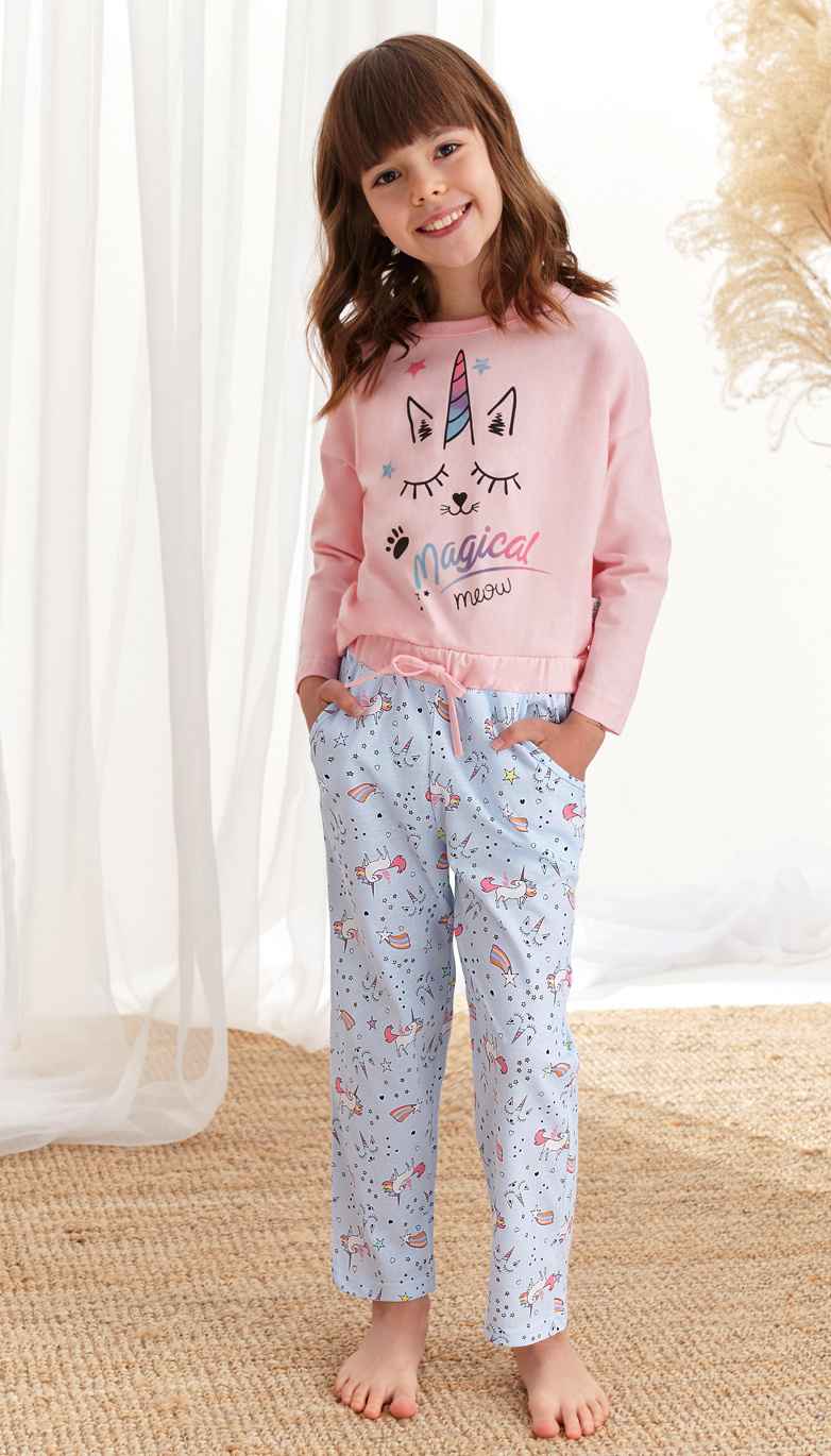 Dětské pyžámko má rovné vzorované kalhoty s kapsami a vázačkou v pase. Jednobarevný horní díl je zdobený tiskem s motivem jednorožce a nápisem.