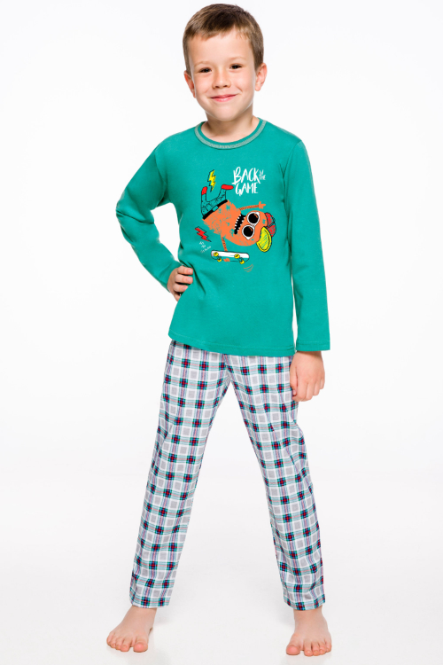 Chlapecké pyžamo má rovné kostkované kalhoty a jednobarevný horní díl s potiskem. Rovné rukávy, kolem výstřihu štepování.