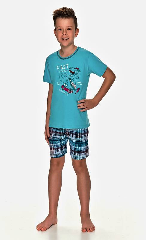 Dětské pyžamo s krátkým rukávem má jednobarevné tričko s potiskem, lemování u krku. Kostkované šortky mají širší všitou gumu.