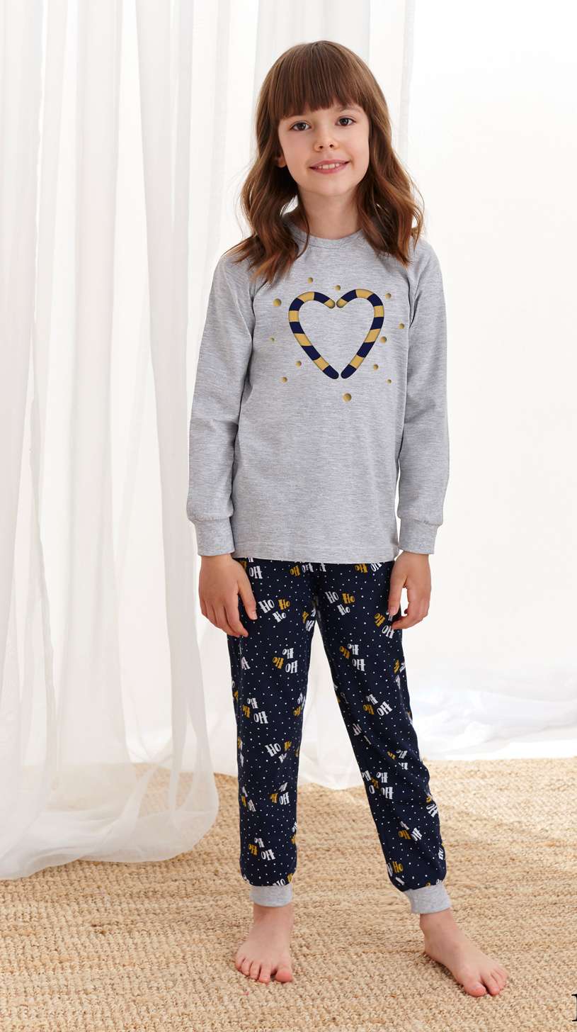 Dívčí pyžamo má vzorované kalhoty ukončené nápletem, horní díl je ozdoben srdíčkem.