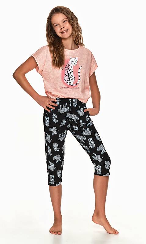 Dívčí pyžamo má potištěné úzké 3/4 kalhoty s kapsami, v pase široká guma. Tričko z jednobarevného materiálu je ozdobené tiskem na předním dílu.