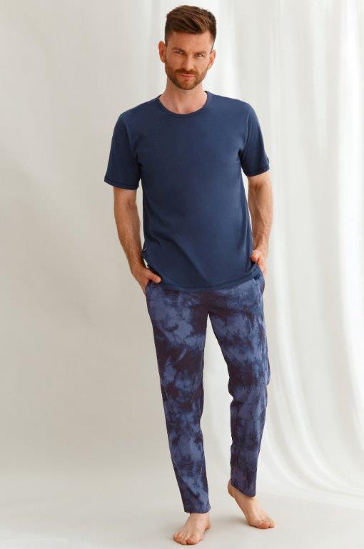Pánské pyžamo má jednobarevné triko s krátkým rukávem a dlouhé batikované kalhoty. V pase široká prošitá guma a dvě kapsy.