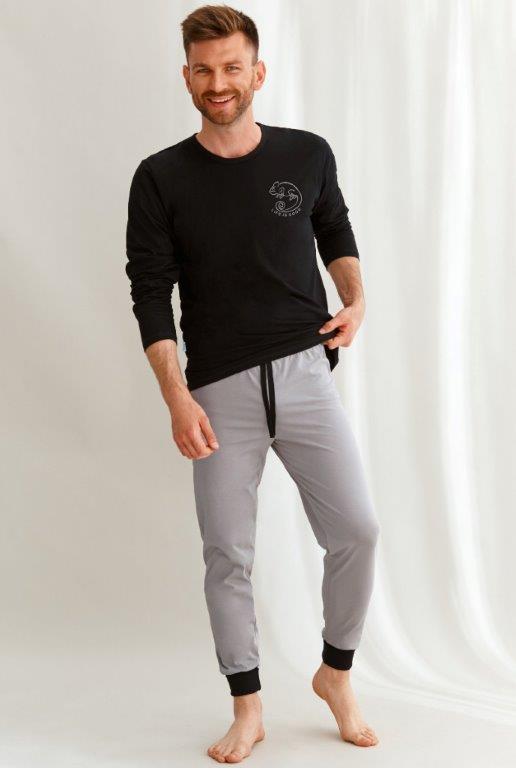 Pánské pyžamo má kalhoty ukončené nápletem, v pase je široká prošitá guma a šňůrka. Jednobarevné triko má kulatý výstřih, dlouhé rovné rukávy a je ozdobené obrázkem leguána.