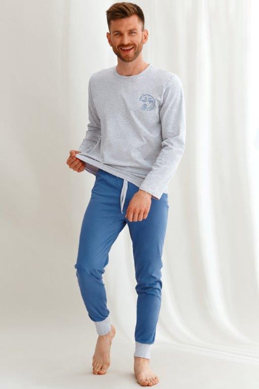 Pánské pyžamo má kalhoty ukončené nápletem, v pase je široká prošitá guma a šňůrka. Jednobarevné triko má kulatý výstřih, dlouhé rovné rukávy a je ozdobené obrázkem leguána.