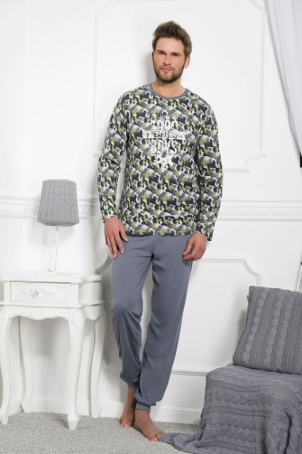 Pánské pyžamo má jednobarevné kalhoty zakončené nápletem a maskáčové triko s potiskem.