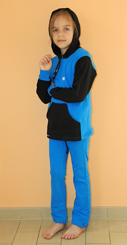 Dívčí tepláková souprava z jemně počesaného materiálu má mírně rozšířené kalhoty se širokou gumou v pase. Bunda má rovný střih, na spodním okraji tunýlek se stahovací šňůrkou, kapsu klokanku a stahovací kapuci. Rukáv je zakončený nápletem.
