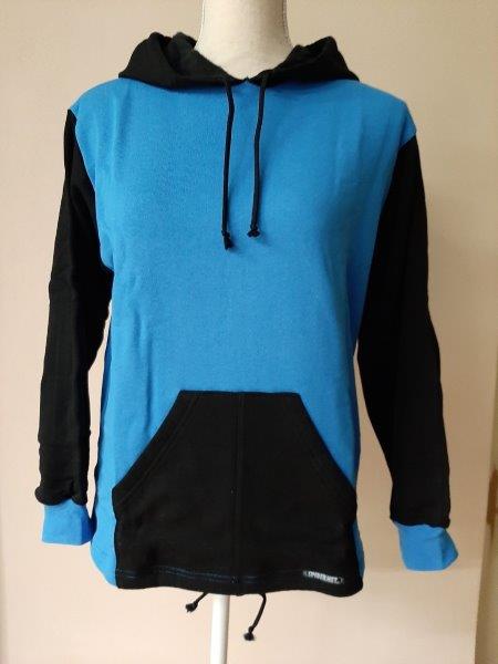 Dívčí tepláková souprava z jemně počesaného materiálu má mírně rozšířené kalhoty se širokou gumou v pase. Bunda má rovný střih, na spodním okraji tunýlek se stahovací šňůrkou, kapsu klokanku a stahovací kapuci. Rukáv je zakončený nápletem. Tepláky jsou z tmavého materiálu, bunda kombinovaná.