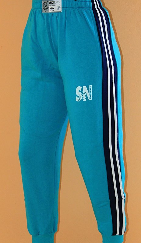 Tepláky jsou vyrobeny z počesaného úpletu. V pase široká guma, na boku lampas, jedna boční kapsa, nohavice ozdobené tiskem a ukončené nápletem.