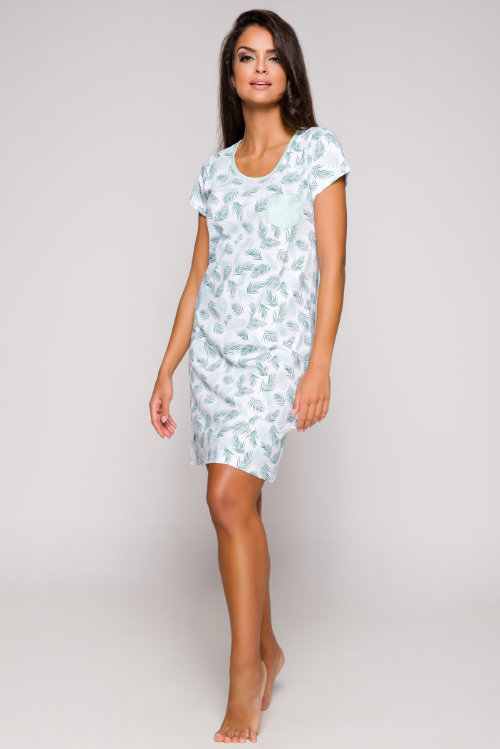 Dámská noční košile s krátkým rukávkem je vyrobena z jemně potištěného materiálu, ozdobená malou kapsičkou.