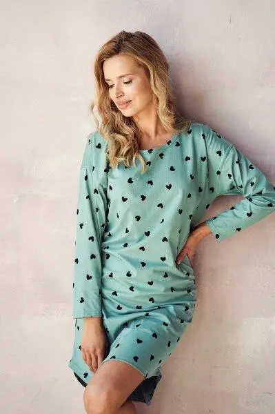 Jednoduchá dámská noční košile s dlouhým rukávem z potištěného tyrkysového materiálu. Kulatý výstřih, délka ke kolenům, spodní okraj tvarovaný.