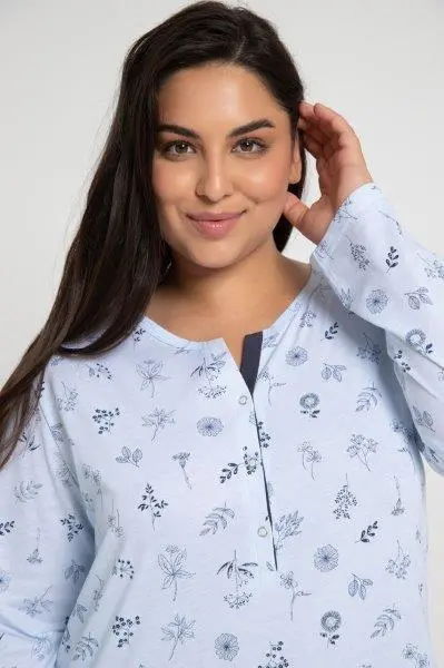 Dámská noční košile z jemně potištěného materiálu má propínací légu na 3 patentky. Rovné rukávy, délka ke kolenům.