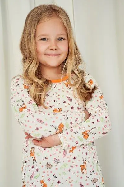 Dětská noční košilka je vyrobena z potištěné bavlny s motivem lesních zvířátek. Dlouhý rukáv je rovný, zakončený ozdobným štepováním, stejně jako mírně tvarovaný spodní okraj košilky. U krku barevné lemování.
