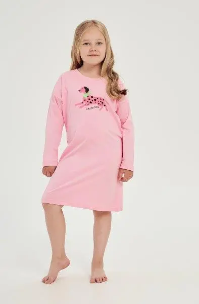 Dětská růžová noční košilka s dlouhým rukávem je ozdobená obrázkem pejska. Je vyrobená z měkké bavlny, délka ke kolenům, rovný rukáv, kulatý výstřih.