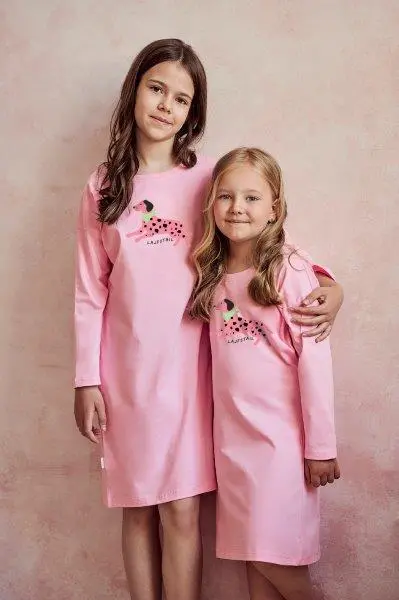 Dětská růžová noční košilka s dlouhým rukávem je ozdobená obrázkem pejska. Je vyrobená z měkké bavlny, délka ke kolenům, rovný rukáv, kulatý výstřih.