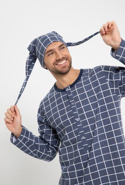 Oblíbená kostkovaná pánská noční košile s dlouhým rukávem. Propínací léga na 4 knoflíky, rovné rukávy, na bocích rozparky. Součástí balení je čepička.