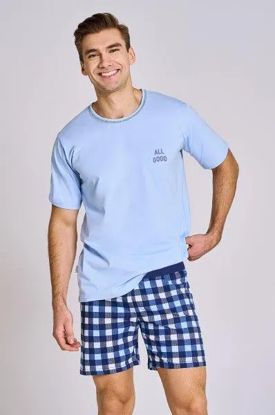 Pánské pyžamo s krátkým rukávem má světle modré triko s kulatým výstřihem ozdobené malým tiskem. Kostkované kalhoty mají širokou gumu v pase.