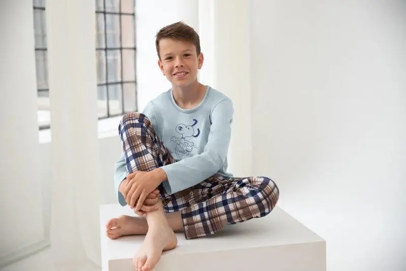 Chlapecké pyžamo s rovným dlouhým rukávem má kulatý výstřih ozdobený štepováním a tiskna předním dílu. Dlouhé kostkované kalhoty mají rovný střih bez nápletu, v pase široká guma.