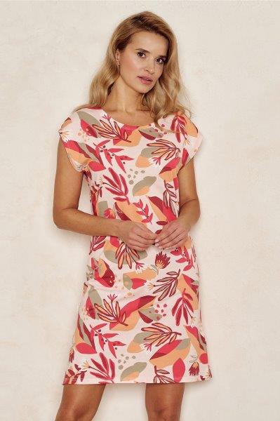 Dámská noční košile s krátkým rukávkem má kulatý výstřih a je vyrobena z potištěného květovaného materiálu. Na bocích jsou rozparky, je vhodná i jako pohodlné domácí oblečení.