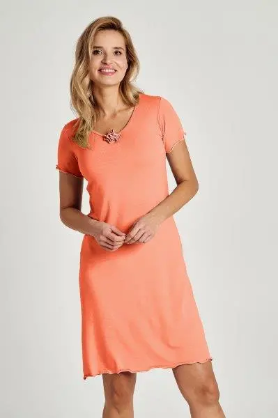 Jednoduchá dámská noční košile z příjemného modalu krátký rukáv, délku nad kolena. Výstřih do V je ozdobený kytičkou ze stejného materiálu.