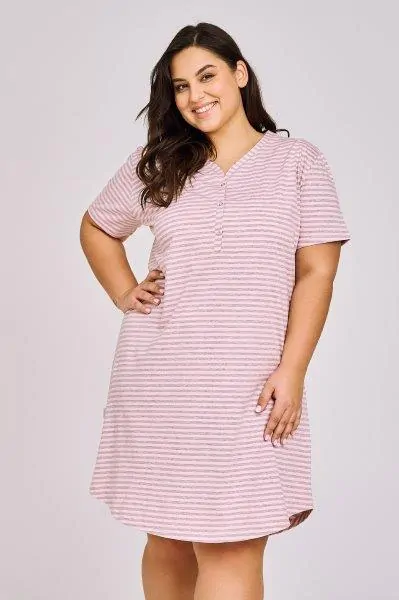 Dámská noční košile s krátkým rukávem z proužkovaného šedo-růžového materiálu má propínací légu na 3 patentky, spodní okraj je tvarovaný.