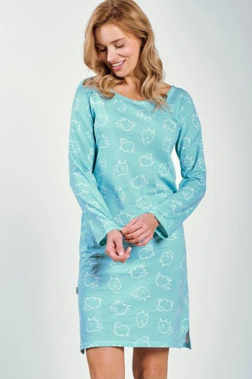Oblíbená dámská noční košile s dlouhým rukávem z tyrkysového úpletu s potiskem oveček. Kulatý výstřih, délka nad kolena, na bocích rozparky.