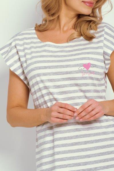 Slušivá dámská noční košilka je vyrobena z proužkovaného úpletu, má motýlkové rukávy a je ozdobená malým tiskem.