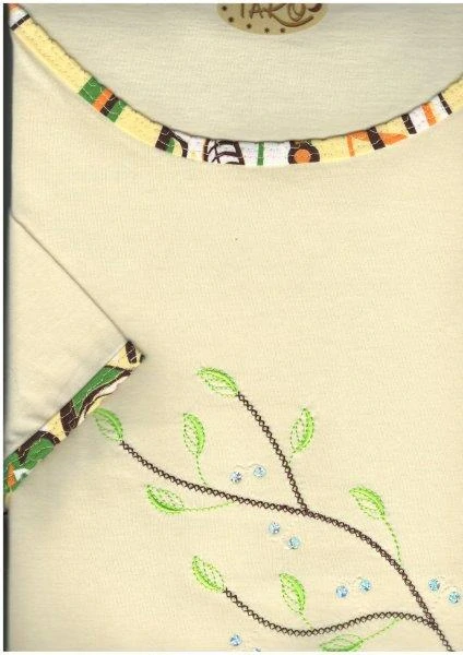 Dámské pyžamo s krátkým rukávem má jednobarevné tričko ozdobené tiskem nebo výšivkou na předním dílu, kulatý výstřih a okraje rukávů jsou zdobeny paspulí. Kalhoty jsou potištěné, mají rovný střih, v pase široká guma.