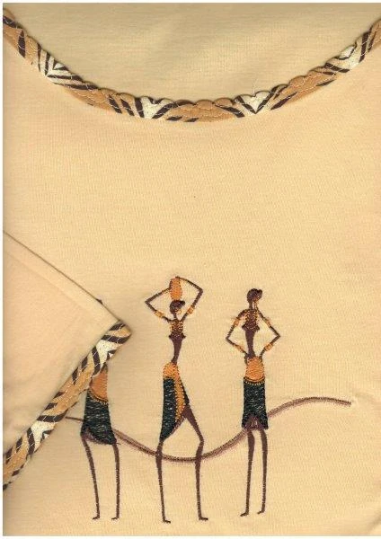 Dámské pyžamo s krátkým rukávem má jednobarevné tričko ozdobené tiskem nebo výšivkou na předním dílu, kulatý výstřih a okraje rukávů jsou zdobeny paspulí. Kalhoty jsou potištěné, mají rovný střih, v pase široká guma.