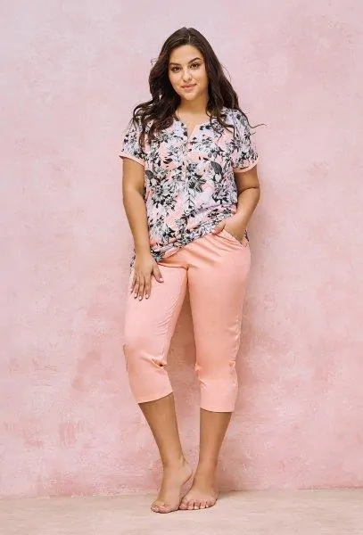 Dámské pyžamo má volné kalhoty s kapsami v délce 3/4. Horní díl propínací na 3 knoflíčky, lemované krátké rukávy.