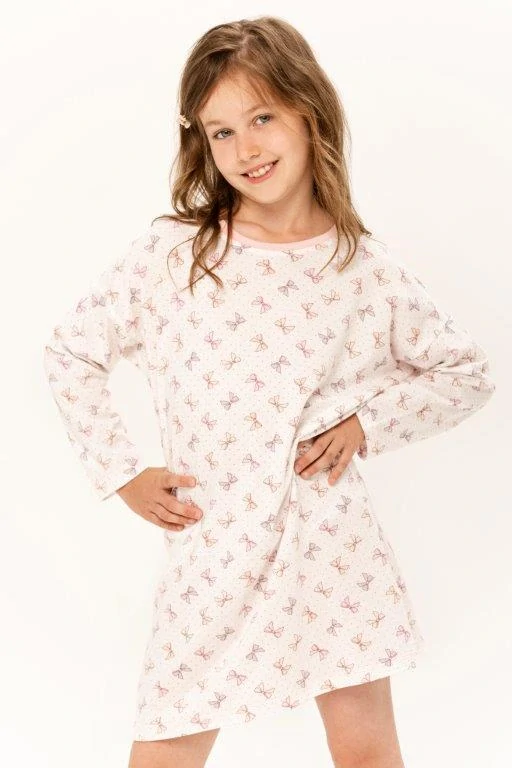 Dětská noční košilka z úpletu s motivem mašliček. Dlouhý rukáv, pružný lem u krku.