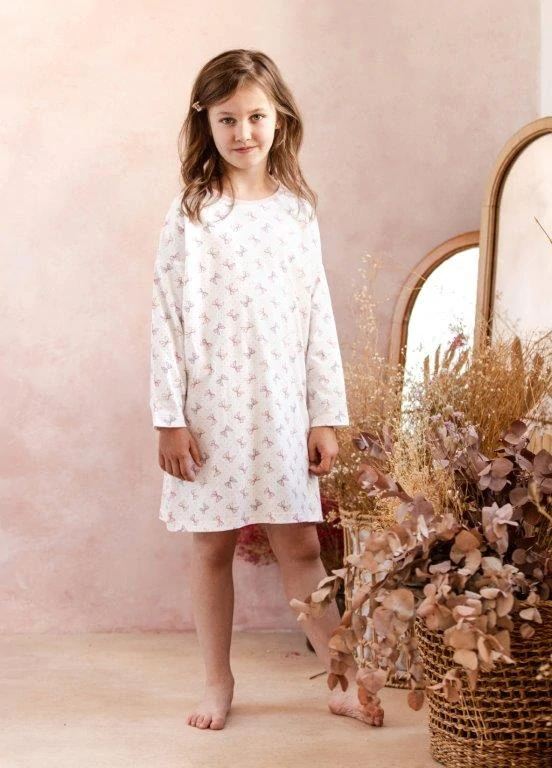 Dětská noční košilka z úpletu s motivem mašliček. Dlouhý rukáv, pružný lem u krku.