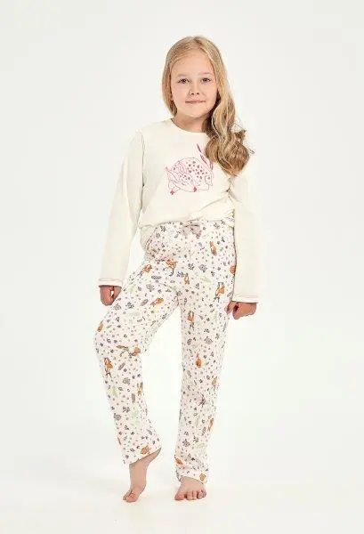 Dětské pyžamo má tričko s kulatým výstřihem, na předním dílu je potisk. Dlouhý rovný rukáv a spodní okraj trička jsou zakončeny ozdobným štepováním. Rovné kalhoty z potištěného materiálu mají v pase širokou gumu s mašličkou.